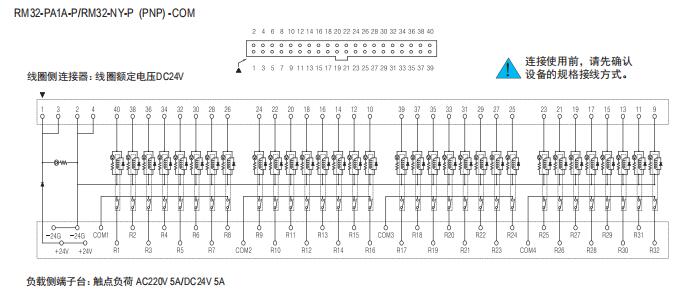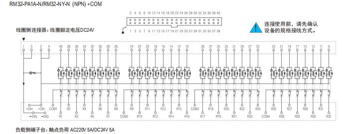 RM32-PA1A-N | PA1a-24V | 32點(diǎn) (1a×32) | 24V DC | NPN +com | 8點(diǎn)Com. | Connector MIL-C-83503 40pin | M3 螺絲端子臺 7.62mm 間距 | 174.0×70.0 | 導(dǎo)軌固定 |