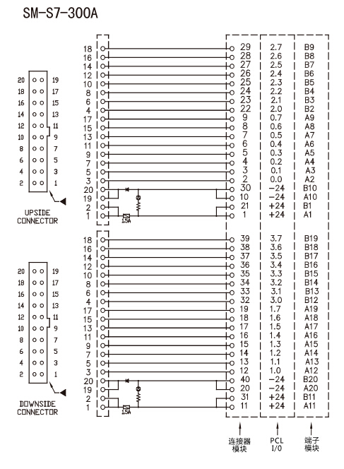 SM-S7-300A | 32Point | 40 | MlL Stanfard | HIF3BA-20PA-2.54DSA*2 | 電源表示LED,電源側Diode | Digital I/O專用 |